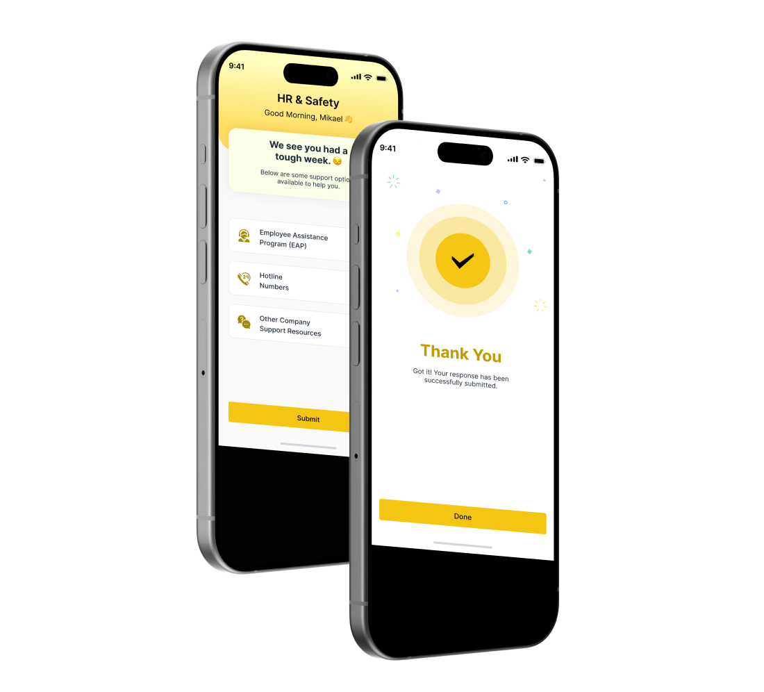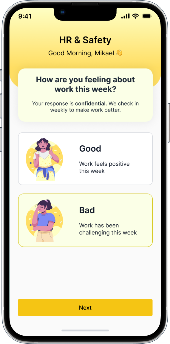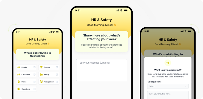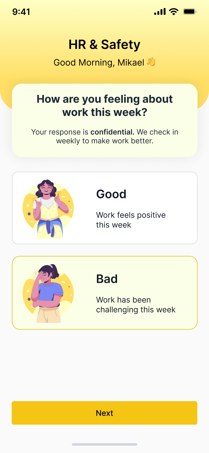 In this application, an employee can quickly share how their week went, highlight what went well or not, and give shoutouts to teammates. All feedback stays confidential and helps improve work, culture, and team safety.