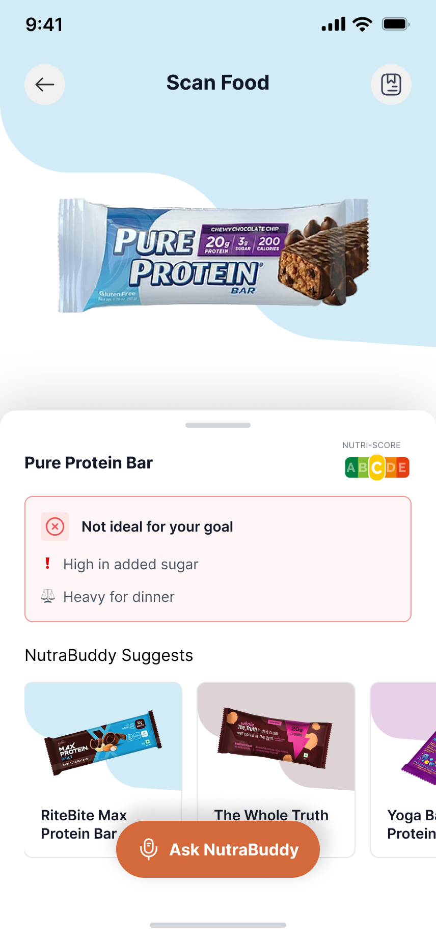 Scan your food: Just point your camera, and NutraScan instantly reads the product for you.
